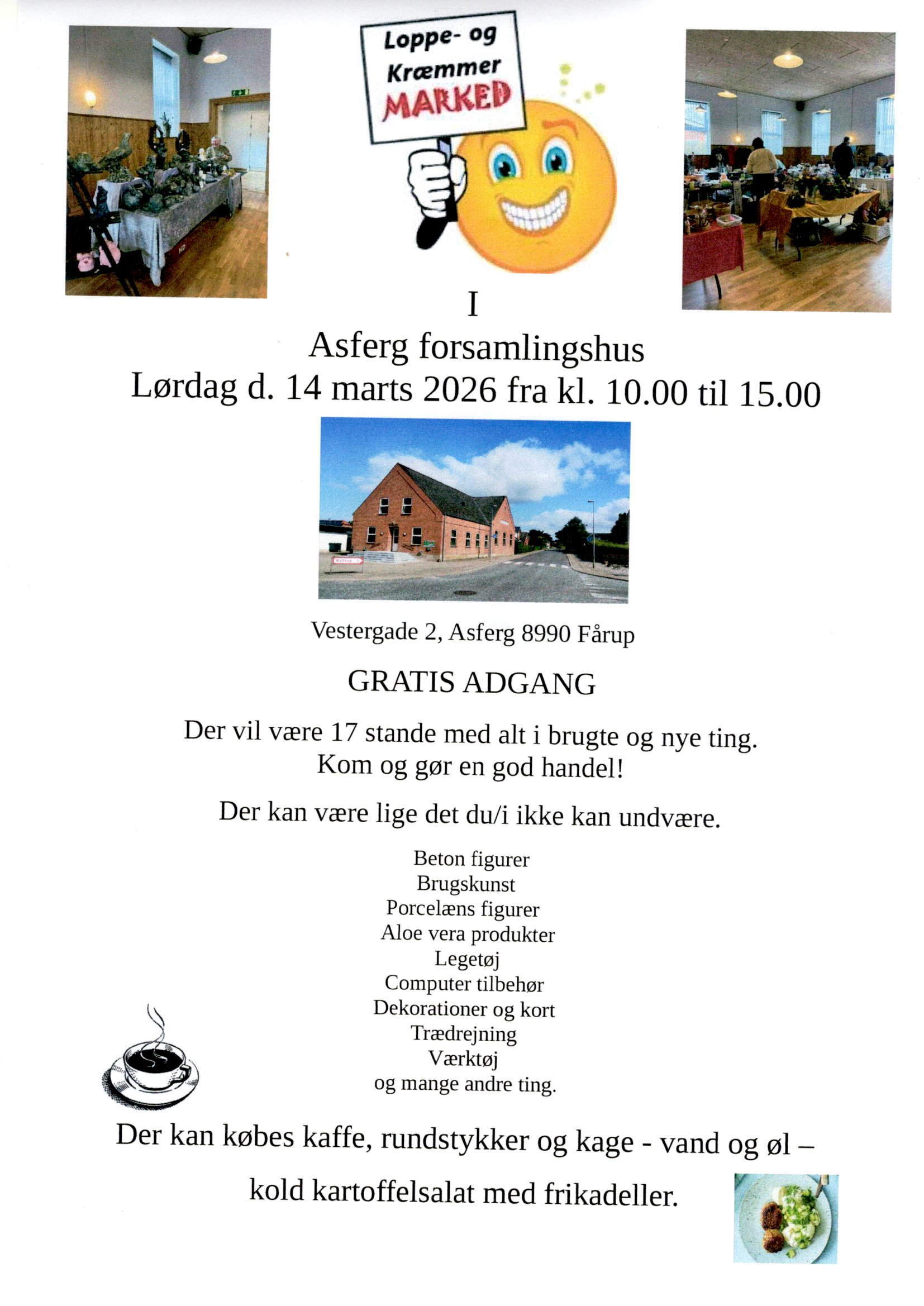 Loppe og kræmmermarked + Add to Google Calendar + iCal / Outlook export 00 days 00 hours 00 minutes 00 seconds Date mar 14 2026 Time 10:00 - 15:00 Location Asferg forsamlingshus Vestergade 2 Asferg, 8990 Fårup Website http://www.asfergforsamlingshus.dk Phone 93868186 Category Loppe og kræmmer marked Organizer Asferg forsamlingshus Phone 93868186 Email asfergforsamlingshus@gmail.com Share this event